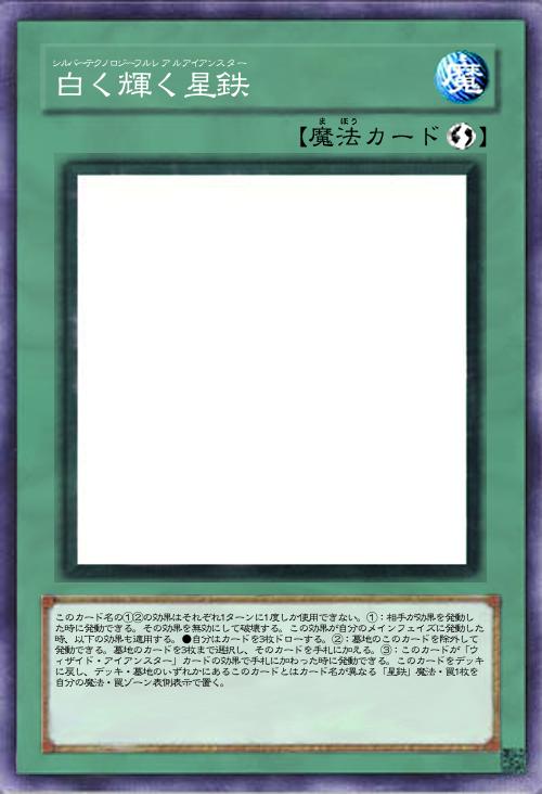 | このカード名の①②の効果はそれぞれ1ターンに1度しか使用できない。①:相手が効果を発動した時に発動できる。その効果を無効にして破壊する。この効果が自分のメインフェイズに発動した時、以下の効果も適用する。●自分はカードを3枚ドローする。②:墓地のこのカードを除外して発動できる。墓地のカードを3枚まで選択し、そのカードを手札に加える。③:このカードが「ウィザイド・アイアンスター」カードの効果で手札に加わった時に発動できる。このカードをデッキに戻し、デッキ・墓地のいずれかにあるこのカードとはカード名が異なる「星鉄」魔法・罠1枚を自分の魔法・罠ゾーン表側表示で置く。 | |||