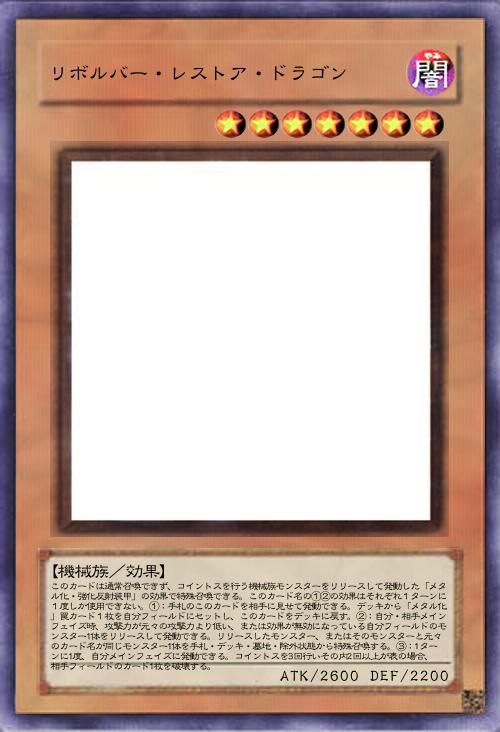 「原作の城之内VSキースにて、リボルバー・ドラゴンが時の魔術師の効果で錆びさせられてやられた後、タイム・マシーンで復活した展開を再現しました。レストア(修復)したためにステータスはリボルバー・ドラゴンそのままです。」(2024-06-17 22:17)