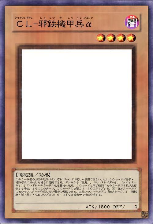 | このカード名の①②の効果はそれぞれ1ターンに1度しか使用できない。①:このカードが召喚・特殊召喚に成功した場合に発動できる。デッキから「巨悪」、「セレスレイダー」、「ケイオスレギオン」のいずれかのカード1枚を墓地へ送る。このカードと同じ縦列に他のカードが1枚以上存在する場合、さらにこのターン、このカードの攻撃力は1200アップする。②:自分フィールドに他のモンスターが存在しない場合に発動できる。お互いのフィールドに「雑兵トークン」(機械族・闇・星1・攻500/守0)を1体ずつ守備表示で特殊召喚する。 | |||
