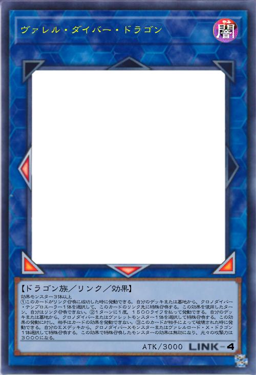 | 効果モンスター3体以上 ①このカードがリンク召喚に成功した時に発動できる。自分のデッキまたは墓地から、クロノダイバー・テンプロエーラー1体を選択して、このカードのリンク先に特殊召喚する。この効果を使用したターン、自分はリンク召喚できない。②1ターンに1度、1500ライフを払って発動できる。自分のデッキまたは墓地から、クロノダイバーまたはヴァレットモンスター1体を選択して特殊召喚する。この効果の発動に対し、相手はカードの効果を発動できない。③このカードが相手によって破壊された時に発動できる。自分のEXデッキから、クロノダイバーXモンスターまたはヴァレルロード・X・ドラゴン1体選択して特殊召喚する。この効果で特殊召喚したモンスターの効果は無効になり、元々の攻撃力は3000になる。 | |||