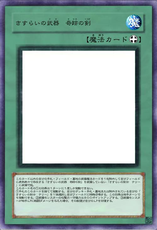 | このカード以外の自分の手札・フィールド・墓地の装備魔法カードを1枚除外して自分フィールドに表側表示で存在する「さすらいの武器 奇跡の剣」を装備していない「さすらいの剣士 テリー」に装備可能。 このカード名の①の効果は1ターンに1度しか発動できない。 ①手札のこのカードを捨てて発動する。自分のデッキ・手札・墓地または除外されている自分の「さすらいの剣士 テリー」を1体選択し自分フィールドに特殊召喚する。この効果は相手ターンでも発動できる。②装備モンスターの攻撃力・守備力は800ポイントアップする。③装備モンスターが相手LPに戦闘ダメージを与えた場合、その数値分自分のLPを回復する。 | |||