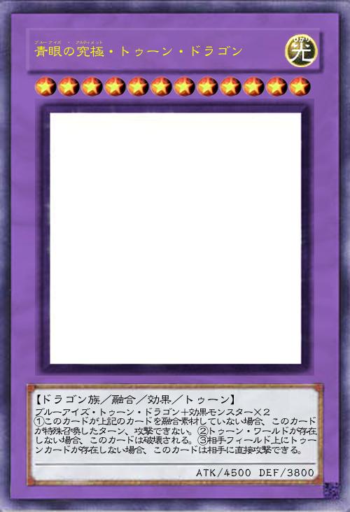 | ブルーアイズ・トゥーン・ドラゴン+効果モンスター×2 ①このカードが上記のカードを融合素材していない場合、このカードが特殊召喚したターン、攻撃できない。②トゥーン・ワールドが存在しない場合、このカードは破壊される。③相手フィールド上にトゥーンカードが存在しない場合、このカードは相手に直接攻撃できる。 | |||