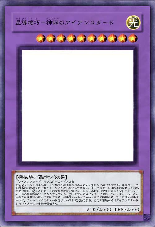 | 「アイアンスタード」モンスターカード×3枚 自分フィールドの上記カードを墓地へ送る事でのみEXデッキから特殊召喚できる。このカード名の③④の効果はそれぞれ1ターンに1度しか使用できない。①:このカードは相手の発動した効果を受けない。②:このカードの攻撃力は自分のフィールド・墓地の「マギアストロン」モンスターカードの種類の数×1000アップする。③:お互いのメインフェイズに、手札・フィールドのカード2枚を墓地へ送って発動できる。相手フィールドのカードを全て破壊する。④:自分・相手ターンに、フィールドのこのカードをリリースして発動できる。自分の墓地から「アイアンスタード」モンスター2体を特殊召喚する。 | |||