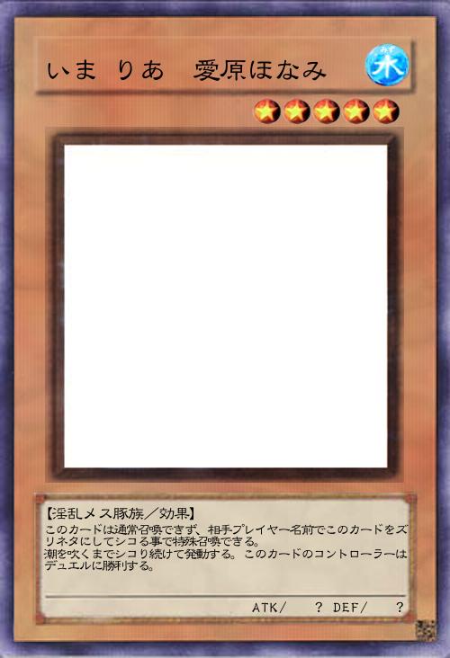 | このカードは通常召喚できず、相手プレイヤー名前でこのカードをズリネタにしてシコる事で特殊召喚できる。 潮を吹くまでシコり続けて発動する。このカードのコントローラーはデュエルに勝利する。 | |||