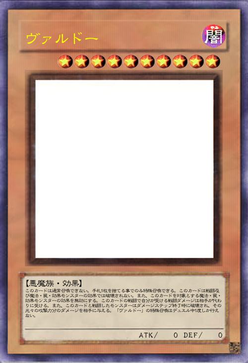 | このカードは通常召喚できない。手札1枚を捨てる事でのみ特殊召喚できる。このカードは戦闘及び魔法・罠・効果モンスターの効果では破壊されない。また、このカードを対象とする魔法・罠・効果モンスターの効果を無効にする。このカードの戦闘で自分が受ける戦闘ダメージは相手が代わりに受ける。また、このカードと戦闘したモンスターはダメージステップ終了時に破壊され、その元々の攻撃力分のダメージを相手に与える。「ヴァルドー」の特殊召喚はデュエル中1度しか行えない。 | |||