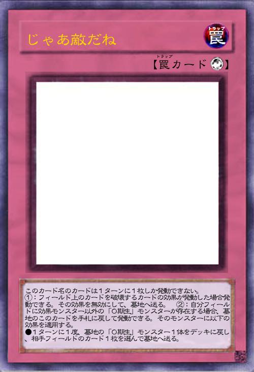 | このカード名のカードは1ターンに1枚しか発動できない。 ①:フィールド上のカードを破壊するカードの効果が発動した場合発動できる。その効果を無効にして、墓地へ送る。 ②:自分フィールドに効果モンスター以外の「0期生」モンスターが存在する場合、墓地のこのカードを手札に戻して発動できる。そのモンスターに以下の効果を適用する。 ●1ターンに1度、墓地の「0期生」モンスター1体をデッキに戻し、相手フィールドのカード1枚を選んで墓地へ送る。 | |||