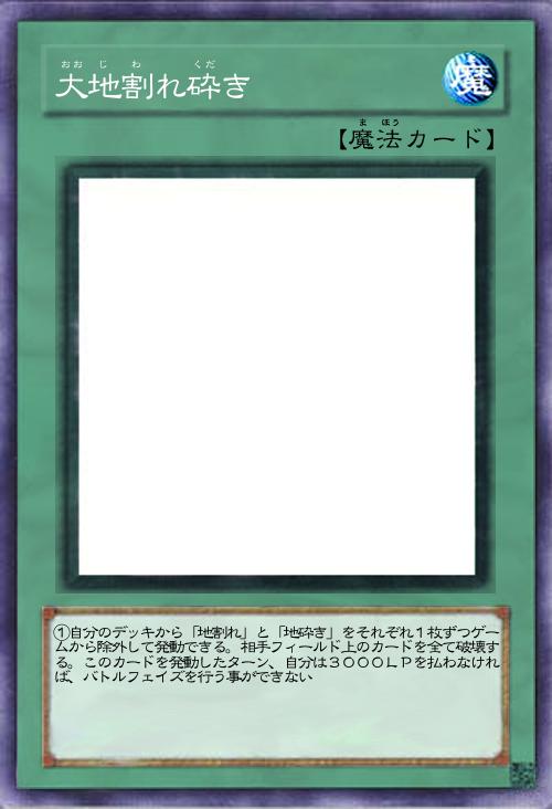 | ①自分のデッキから「地割れ」と「地砕き」をそれぞれ1枚ずつゲームから除外して発動できる。相手フィールド上のカードを全て破壊する。このカードを発動したターン、自分は3000LPを払わなければ、バトルフェイズを行う事ができない | |||