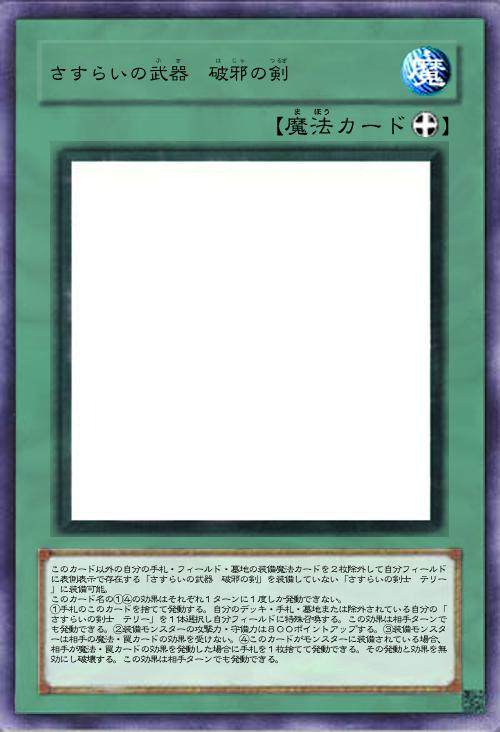 | このカード以外の自分の手札・フィールド・墓地の装備魔法カードを2枚除外して自分フィールドに表側表示で存在する「さすらいの武器 破邪の剣」を装備していない「さすらいの剣士 テリー」に装備可能。 このカード名の①④の効果はそれぞれ1ターンに1度しか発動できない。 ①手札のこのカードを捨てて発動する。自分のデッキ・手札・墓地または除外されている自分の「さすらいの剣士 テリー」を1体選択し自分フィールドに特殊召喚する。この効果は相手ターンでも発動できる。②装備モンスターの攻撃力・守備力は800ポイントアップする。③装備モンスターは相手の魔法・罠カードの効果を受けない。④このカードがモンスターに装備されている場合、相手が魔法・罠カードの効果を発動した場合に手札を1枚捨てて発動できる。その発動と効果を無効にし破壊する。この効果は相手ターンでも発動できる。 | |||
