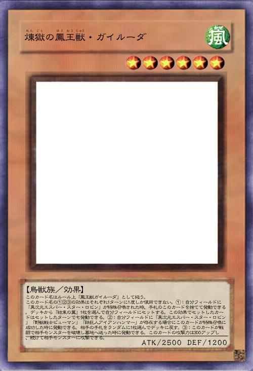| このカード名はルール上「鳳王獣ガイルーダ」として扱う。 このカード名の①②③の効果はそれぞれ1ターンに1度しか使用できない。①:自分フィールドに「異次元エスパー・スター・ロビン」が特殊召喚された時、手札のこのカードを捨てて発動できる。デッキから「結束の翼」1枚を選んで自分フィールドにセットする。この効果でセットしたカードはセットしたターンでも発動できる。②:自分フィールドに「異次元エスパー・スター・ロビン」「野獣戦士ピューマン」「鉄巨人アイアンハンマー」が存在する場合にこのカードが特殊召喚に成功した時に発動できる。相手の手札をランダムに1枚選んでデッキに戻す。③:このカードが戦闘で相手モンスターを破壊し墓地へ送った時に発動できる。このカードの攻撃力は300アップし、続けて相手モンスターに攻撃できる。 | |||