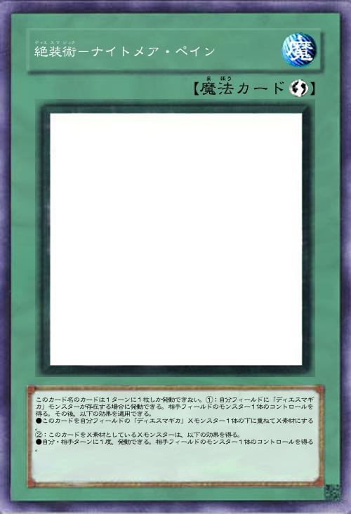 | このカード名のカードは1ターンに1枚しか発動できない。①:自分フィールドに「ディエスマギカ」モンスターが存在する場合に発動できる。相手フィールドのモンスター1体のコントロールを得る。その後、以下の効果を適用できる。 ●このカードを自分フィールドの「ディエスマギカ」Xモンスター1体の下に重ねてX素材にする。 ②:このカードをX素材としているXモンスターは、以下の効果を得る。 ●自分・相手ターンに1度、発動できる。相手フィールドのモンスター1体のコントロールを得る。 | |||