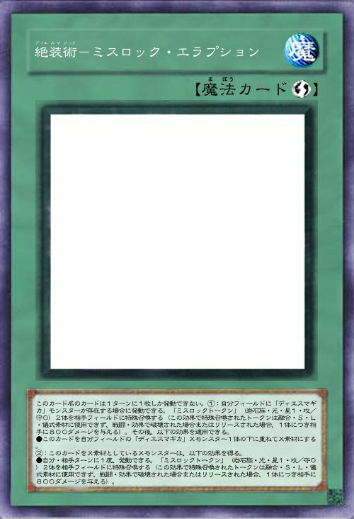 | このカード名のカードは1ターンに1枚しか発動できない。①:自分フィールドに「ディエスマギカ」モンスターが存在する場合に発動できる。「ミスロックトークン」(岩石族・光・星1・攻/守0)2体を相手フィールドに特殊召喚する(この効果で特殊召喚されたトークンは融合・S・L・儀式素材に使用できず、戦闘・効果で破壊された場合またはリリースされた場合、1体につき相手に800ダメージを与える)。その後、以下の効果を適用できる。 ●このカードを自分フィールドの「ディエスマギカ」Xモンスター1体の下に重ねてX素材にする。 ②:このカードをX素材としているXモンスターは、以下の効果を得る。 ●自分・相手ターンに1度、発動できる。「ミスロックトークン」(岩石族・光・星1・攻/守0)2体を相手フィールドに特殊召喚する(この効果で特殊召喚されたトークンは融合・S・L・儀式素材に使用できず、戦闘・効果で破壊された場合またはリリースされた場合、1体につき相手に800ダメージを与える)。 | |||
