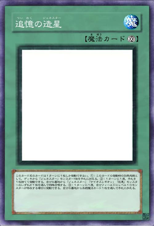 | このカード名のカードは1ターンに1枚しか発動できない。①:このカードの発動時の効果処理として、デッキから「ジェネスター」モンスター1体を手札に加える。②:1ターンに1度、手札を1枚捨てて発動できる。自分の墓地から「ジェネスター」「ケイオスレギオン」「巨悪」モンスターのいずれか1体を選んで特殊召喚する。③:1ターンに1度、自分フィールドにレベル10モンスターが存在する場合に発動できる。自分の墓地から永続魔法カード1枚を選んで手札に加える。 | |||