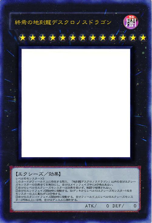 | レベル10モンスター×3 このカードがフィールド上に存在する限り、「地刻龍デスクロノスドラゴン」以外の自分エクシーズモンスターの効果全てを無効にし、自分はメインフェイズ中にX召喚出来ない。 ①自分のレベル13エクシーズモンスターは効果を受けず、戦闘で破壊されない。 ②自分のエンドフェイズ開始時に発動する。EXデッキからレベル13エクシーズモンスター1枚をモンスターの上に重ねずにX召喚する。 ③自分のスタンバイフェイズ開始時に発動する。自分フィールド上にレベル13エクシーズモンスターが5体以上いる時、自分はデュエルに勝利する。 | |||