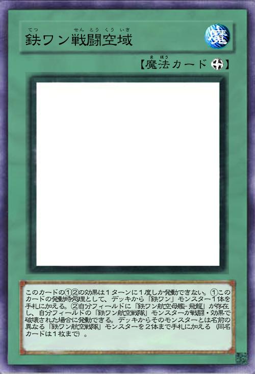 | このカードの①②の効果は1ターンに1度しか発動できない。①このカードの発動時処理として、デッキから「鉄ワン」モンスター1体を手札に加える。②自分フィールドに「鉄ワン航空母艦-飛龍」が存在し、自分フィールドの「鉄ワン航空戦隊」モンスターが戦闘・効果で破壊された場合に発動できる。デッキからそのモンスターとは名前の異なる「鉄ワン航空戦隊」モンスターを2体まで手札に加える(同名カードは1枚まで)。 | |||