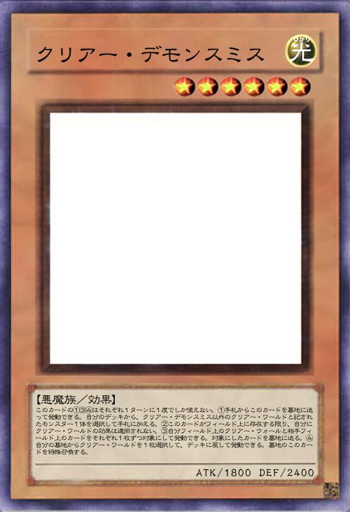 | このカードの①③④はそれぞれ1ターンに1度でしか使えない。①手札からこのカードを墓地に送って発動できる。自分のデッキから、クリアー・デモンスミス以外のクリアー・ワールドと記されたモンスター1体を選択して手札に加える。②このカードがフィールド上に存在する限り、自分にクリアー・ワールドの効果は適用されない。③自分フィールド上のクリアー・ウォールと相手フィールド上のカードをそれぞれ1枚ずつ対象にして発動できる。対象にしたカードを墓地に送る。④自分の墓地からクリアー・ワールドを1枚選択して、デッキに戻して発動できる。墓地のこのカードを特殊召喚する。 | |||