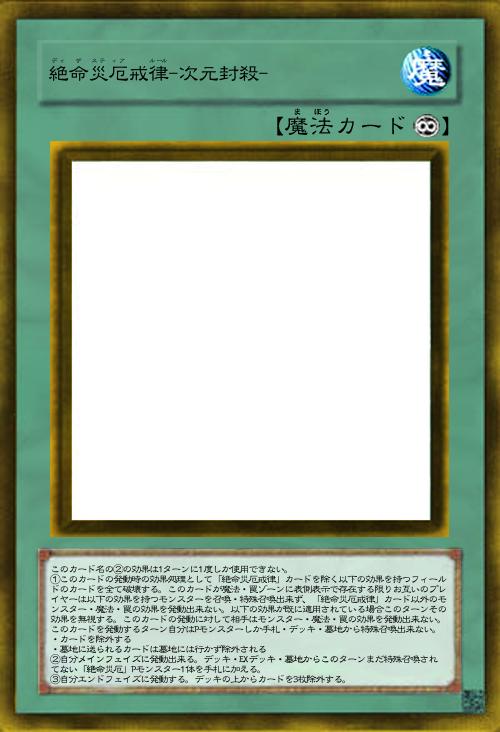 | このカード名の②の効果は1ターンに1度しか使用できない。 ①このカードの発動時の効果処理として「絶命災厄戒律」カードを除く以下の効果を持つフィールドのカードを全て破壊する。このカードが魔法・罠ゾーンに表側表示で存在する限りお互いのプレイヤーは以下の効果を持つモンスターを召喚・特殊召喚出来ず、「絶命災厄戒律」カード以外のモンスター・魔法・罠の効果を発動出来ない。以下の効果が既に適用されている場合このターンその効果を無視する。このカードの発動に対して相手はモンスター・魔法・罠の効果を発動出来ない。このカードを発動するターン自分はPモンスターしか手札・デッキ・墓地から特殊召喚出来ない。 ・カードを除外する ・墓地に送られるカードは墓地には行かず除外される ②自分メインフェイズに発動出来る。デッキ・EXデッキ・墓地からこのターンまだ特殊召喚されてない「絶命災厄」Pモンスター1体を手札に加える。 ③自分エンドフェイズに発動する。デッキの上からカードを3枚除外する。 | |||