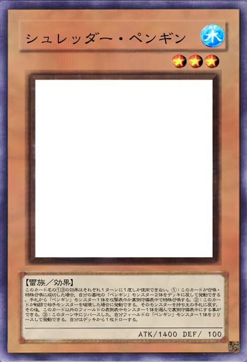 | このカード名の①③の効果はそれぞれ1ターンに1度しか使用できない。①:このカードが召喚・特殊召喚に成功した場合、自分の墓地の「ペンギン」モンスター2体をデッキに戻して発動できる。手札から「ペンギン」モンスター1体を攻撃表示か裏側守備表示で特殊召喚する。②:このカードが戦闘で相手モンスターを破壊した場合に発動できる。そのモンスターを持ち主の手札に戻す。その後、このカード以外のフィールドの表側表示モンスター1体を選んで裏側守備表示にする事ができる。③:このターン中にリバースした、自分フィールドの「ペンギン」モンスター1体をリリースして発動できる。自分はデッキから1枚ドローする。 | |||