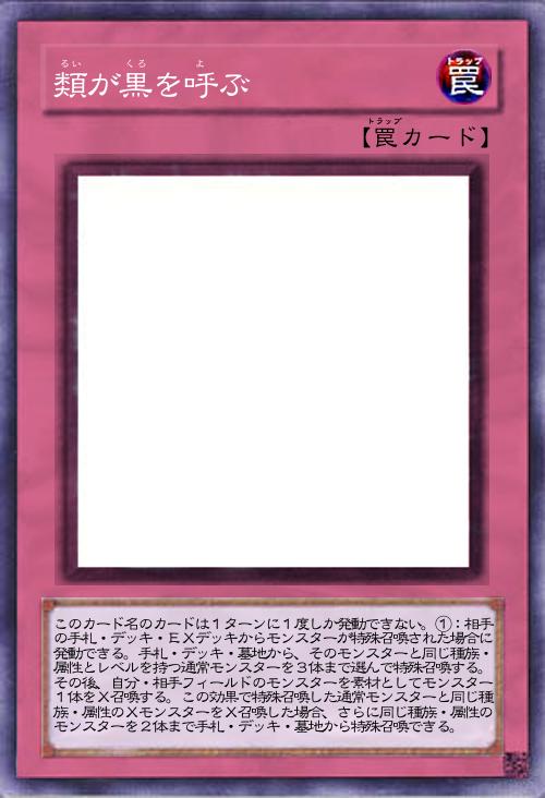 | このカード名のカードは1ターンに1度しか発動できない。①:相手の手札・デッキ・EXデッキからモンスターが特殊召喚された場合に発動できる。手札・デッキ・墓地から、そのモンスターと同じ種族・属性とレベルを持つ通常モンスターを3体まで選んで特殊召喚する。その後、自分・相手フィールドのモンスターを素材としてモンスター1体をX召喚する。この効果で特殊召喚した通常モンスターと同じ種族・属性のXモンスターをX召喚した場合、さらに同じ種族・属性のモンスターを2体まで手札・デッキ・墓地から特殊召喚できる。 | |||