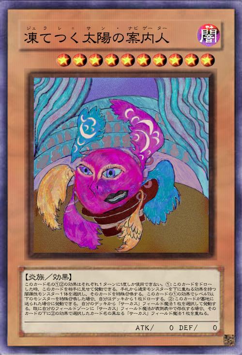 「示唆されてはいた凍てつく太陽こと「ジェラレ=サン」ついにその名を冠した最上級の登場ですね。ですがレベル10で攻守0、外見が翼が生えた赤い生首、自身は観客を重ねる効果を持たない、直接サーカスにアクセスできる等の要素が少なくとも人の形を保っていた今までの団員とは一線を引いた、超常的な存在であることを引き立てているようでいいですね。