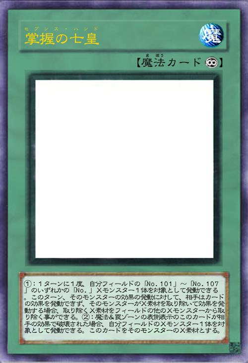 | ①:1ターンに1度、自分フィールドの「No.101」~「No.107」のいずれかの「No.」Xモンスター1体を対象として発動できる。このターン、そのモンスターの効果の発動に対して、相手はカードの効果を発動できず、そのモンスターがX素材を取り除いて効果を発動する場合、取り除くX素材をフィールドの他のXモンスターから取り除く事ができる。②:魔法&罠ゾーンの表側表示のこのカードが相手の効果で破壊された場合、自分フィールドのXモンスター1体を対象として発動できる。このカードをそのモンスターのX素材とする。 | |||