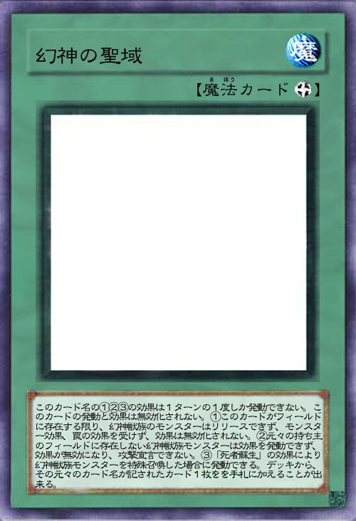 | このカード名の①②③の効果は1ターンの1度しか発動できない。このカードの発動と効果は無効化されない。①このカードがフィールドに存在する限り、幻神獣族のモンスターはリリースできず、モンスター効果、罠の効果を受けず、効果は無効化されない。②元々の持ち主のフィールドに存在しない幻神獣族モンスターは効果を発動できず、効果が無効になり、攻撃宣言できない。③「死者蘇生」の効果により幻神獣族モンスターを特殊召喚した場合に発動できる。デッキから、その元々のカード名が記されたカード1枚をを手札に加えることが出来る。 | |||