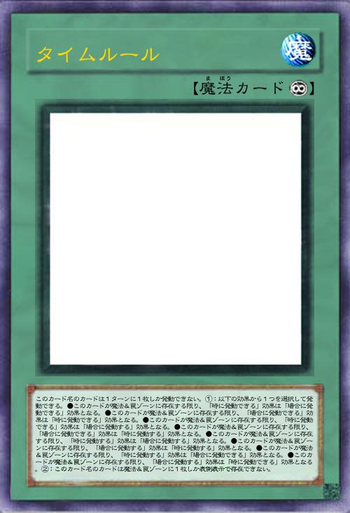 | このカード名のカードは1ターンに1枚しか発動できない。①:以下の効果から1つを選択して発動できる。●このカードが魔法&罠ゾーンに存在する限り、「時に発動できる」効果は「場合に発動できる」効果となる。●このカードが魔法&罠ゾーンに存在する限り、「場合に発動できる」効果は「時に発動できる」効果となる。●このカードが魔法&罠ゾーンに存在する限り、「時に発動できる」効果は「場合に発動する」効果となる。●このカードが魔法&罠ゾーンに存在する限り、「場合に発動できる」効果は「時に発動する」効果となる。●このカードが魔法&罠ゾーンに存在する限り、「時に発動する」効果は「場合に発動する」効果となる。●このカードが魔法&罠ゾーンに存在する限り、「場合に発動する」効果は「時に発動する」効果となる。●このカードが魔法&罠ゾーンに存在する限り、「時に発動する」効果は「場合に発動できる」効果となる。●このカードが魔法&罠ゾーンに存在する限り、「場合に発動する」効果は「時に発動できる」効果となる。②:このカード名のカードは魔法&罠ゾーンに1枚しか表側表示で存在できない。 | |||