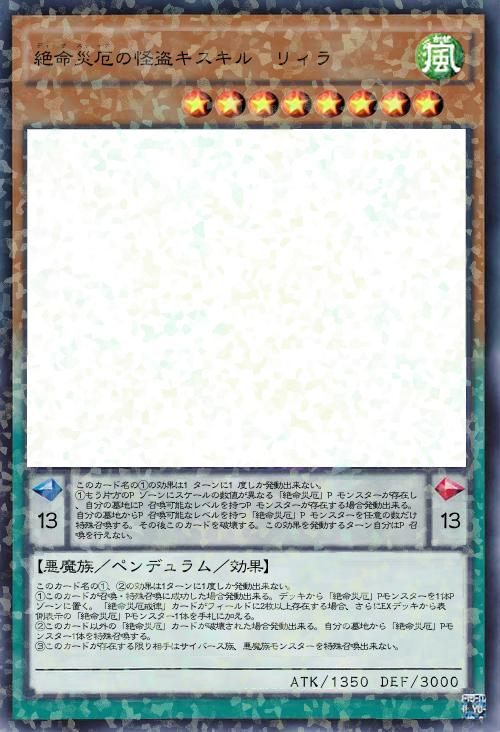 | このカード名の①の効果は1ターンに1度しか発動出来ない。 ①もう片方のPゾーンにスケールの数値が異なる「絶命災厄」Pモンスターが存在し、自分の墓地にP召喚可能なレベルを持つPモンスターが存在する場合発動出来る。自分の墓地からP召喚可能なレベルを持つ「絶命災厄」Pモンスターを任意の数だけ特殊召喚する。その後このカードを破壊する。この効果を発動するターン自分はP召喚を行えない。 | |||