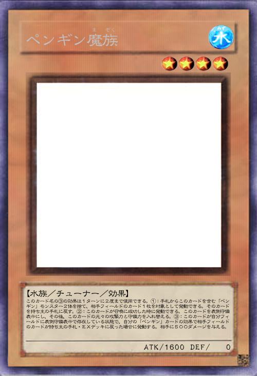 | このカード名の③の効果は1ターンに2度まで使用できる。①:手札からこのカードを含む「ペンギン」モンスター2体を捨て、相手フィールドのカード1枚を対象として発動できる。そのカードを持ち主の手札に戻す。②:このカードが召喚に成功した時に発動できる。このカードを表側守備表示にし、その後、このカードの元々の攻撃力と守備力を入れ替える。③:このカードが自分フィールドに表側守備表示で存在している状態で、自分の「ペンギン」カードの効果で相手フィールドのカードが持ち主の手札・EXデッキに戻った場合に発動する。相手に500ダメージを与える。 | |||