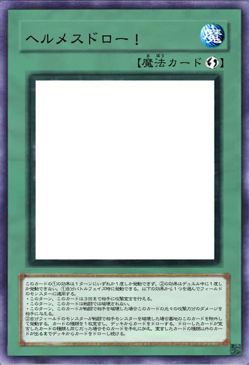 | このカードの①の効果は1ターンにいずれか1度しか発動できず、②の効果はデュエル中に1度しか発動できない。①自分バトルフェイズ時に発動できる。以下の効果から1つを選んでフィールドのモンスターに適用する。 ・このターン、このカードは3回まで相手に攻撃宣言を行える。 ・このターン、このカードは戦闘では破壊されない。 ・このターン、このカードが戦闘で相手を破壊した場合このカードの元々の攻撃力分のダメージを相手に与える。 ②自分フィールドのモンスターが戦闘で相手モンスターを破壊した場合墓地のこのカードを除外して発動する。カードの種類を1枚宣言し、デッキからカードをドローする。ドローしたカードが宣言したカードの種類と同じだった場合そのカードを手札に加え、宣言したカードの種類以外のカードが出るまでデッキからカードをドローし続ける。 | |||