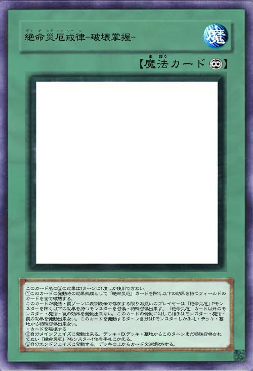 | このカード名の②の効果は1ターンに1度しか使用できない。 ①このカードの発動時の効果処理として「絶命災厄」カードを除く以下の効果を持つフィールドのカードを全て破壊する。 このカードが魔法・罠ゾーンに表側表示で存在する限りお互いのプレイヤーは「絶命災厄」Pモンスターを除く以下の効果を持つモンスターを召喚・特殊召喚出来ず、「絶命災厄」カード以外のモンスター・魔法・罠の効果を発動出来ない。このカードの発動に対して相手はモンスター・魔法・罠の効果を発動出来ない。このカードを発動するターン自分はPモンスターしか手札・デッキ・墓地から特殊召喚出来ない。 ・カードを破壊する ②自分メインフェイズに発動出来る。デッキ・EXデッキ・墓地からこのターンまだ特殊召喚されてない「絶命災厄」Pモンスター1体を手札に加える。 ③自分エンドフェイズに発動する。デッキの上からカードを3枚除外する。 | |||