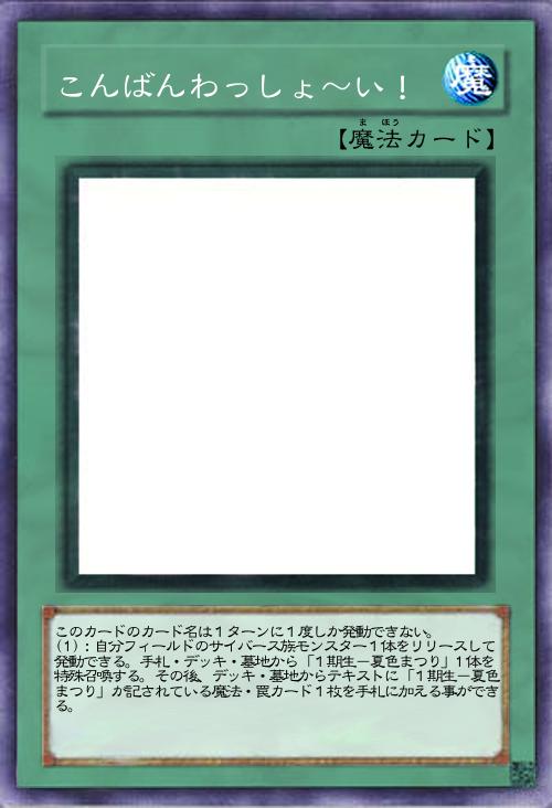 | このカードのカード名は1ターンに1度しか発動できない。 (1):自分フィールドのサイバース族モンスター1体をリリースして発動できる。手札・デッキ・墓地から「1期生-夏色まつり」1体を特殊召喚する。その後、デッキ・墓地からテキストに「1期生-夏色まつり」が記されている魔法・罠カード1枚を手札に加える事ができる。 | |||