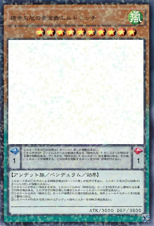 | このカード名の①の効果は1ターンに1度しか発動出来ない。 ①もう片方のPゾーンにスケールの数値が異なる「絶命災厄」Pモンスターが存在する場合発動出来る。デッキから「絶命災厄」Pモンスター1体を墓地に送る。その後、このカードを破壊する。この効果を発動するターン自分はP召喚を行えない。 | |||