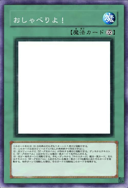 | このカード名の(2)(3)の効果はそれぞれ1ターンに1度だけ発動できる。 (1):このカードは自分フィールドに1枚しか表側表示で存在できない。 (2):自分フィールドに「ST-夕刻ロベル」が存在する場合に発動できる。デッキからテキストに「ST-夕刻ロベル」と記されている魔法・罠カード1枚手札に加える。 (3):自分・相手ターンに発動できる。手札・デッキから「ホロスターズ」魔法・罠カード、またはテキストに「ST-夕刻ロベル」と記されている魔法・罠カード1枚墓地に送りそのカードを発動する。相手ターンで発動した場合、そのカードの発動後このカードを破壊する。 | |||