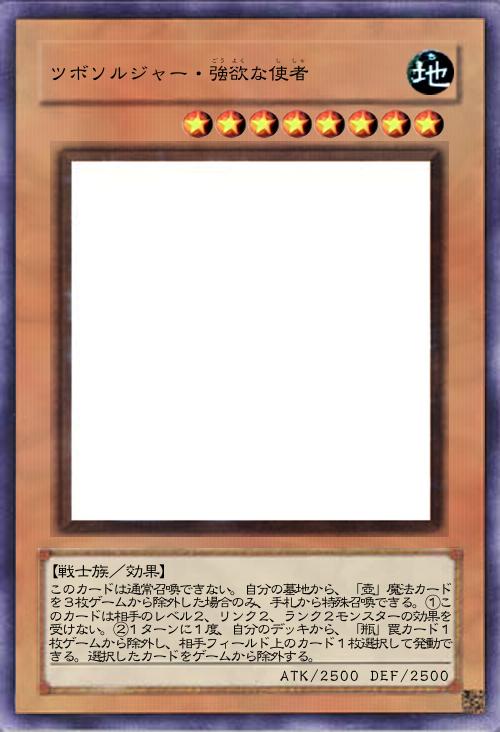 | このカードは通常召喚できない。自分の墓地から、「壺」魔法カードを3枚ゲームから除外した場合のみ、手札から特殊召喚できる。①このカードは相手のレベル2、リンク2、ランク2モンスターの効果を受けない。②1ターンに1度、自分のデッキから、「瓶」罠カード1枚ゲームから除外し、相手フィールド上のカード1枚選択して発動できる。選択したカードをゲームから除外する。 | |||