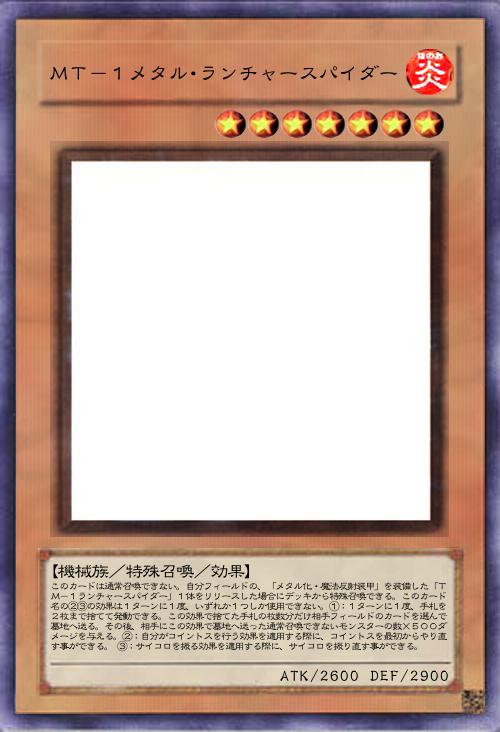 | このカードは通常召喚できない。自分フィールドの、「メタル化・魔法反射装甲」を装備した「TM-1ランチャースパイダー」1体をリリースした場合にデッキから特殊召喚できる。このカード名の②③の効果は1ターンに1度、いずれか1つしか使用できない。①:1ターンに1度、手札を2枚まで捨てて発動できる。この効果で捨てた手札の枚数分だけ相手フィールドのカードを選んで墓地へ送る。その後、相手にこの効果で墓地へ送った通常召喚できないモンスターの数×500ダメージを与える。②:自分がコイントスを行う効果を適用する際に、コイントスを最初からやり直す事ができる。 ③:サイコロを振る効果を適用する際に、サイコロを振り直す事ができる。 | |||