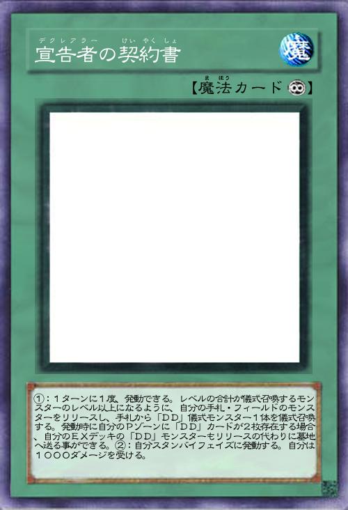 | ①:1ターンに1度、発動できる。レベルの合計が儀式召喚するモンスターのレベル以上になるように、自分の手札・フィールドのモンスターをリリースし、手札から「DD」儀式モンスター1体を儀式召喚する。発動時に自分のPゾーンに「DD」カードが2枚存在する場合、自分のEXデッキの「DD」モンスターもリリースの代わりに墓地へ送る事ができる。②:自分スタンバイフェイズに発動する。自分は1000ダメージを受ける。 | |||