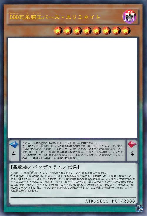 | このカード名の②のP効果は1ターンに1度しか使用できない。 ①:自分フィールドにEXデッキから特殊召喚された「DDD」モンスターが2体以上存在する場合、このカードのPスケールは1になる。②:もう片方の自分のPゾーンに「DDD」カードが存在する場合に発動できる。そのカードを破壊し、デッキから「契約書」カード1枚を選んで自分フィールドにセットする。この効果でセットしたカードはセットしたターンには発動できない。 | |||