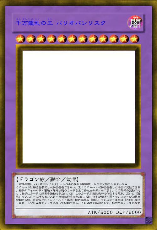 | 「百禍の龍乱 バリオバシリスク」+レベルの異なる闇属性・ドラゴン族モンスター×4 このカードは融合召喚でしか融合召喚できない。①:このカードが融合召喚した場合に発動できる。相手のフィールド・墓地・除外状態のカードを全て持ち主のデッキに戻す。この効果の発動に対して相手はカードの効果を発動できない。②:このカードが表側表示で存在する限り、互いに「龍乱」モンスター以外のモンスターを特殊召喚できない。③:相手が魔法・罠・モンスターの効果を発動する時、自分の手札・フィールド・墓地・除外状態の「龍乱」モンスターまたは「万龍」魔法・罠カード合計4枚をデッキに戻して発動できる。その効果を無効にして、持ち主のデッキに戻す。 | |||