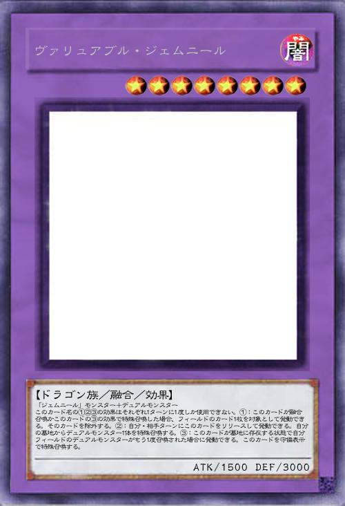 | 「ジェムニール」モンスター+デュアルモンスター このカード名の①②③の効果はそれぞれ1ターンに1度しか使用できない。①:このカードが融合召喚かこのカードの③の効果で特殊召喚した場合、フィールドのカード1枚を対象として発動できる。そのカードを除外する。②:自分・相手ターンにこのカードをリリースして発動できる。自分の墓地からデュアルモンスター1体を特殊召喚する。③:このカードが墓地に存在する状態で自分フィールドのデュアルモンスターがもう1度召喚された場合に発動できる。このカードを守備表示で特殊召喚する。 | |||