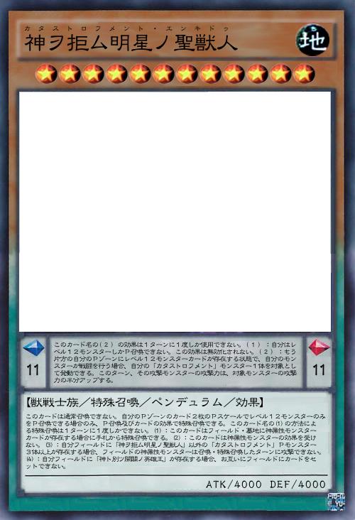| このカードは通常召喚できない。自分のPゾーンのカード2枚のPスケールでレベル12モンスターのみをP召喚できる場合のみ、P召喚及びカードの効果で特殊召喚できる。このカード名の(1)の方法による特殊召喚は1ターンに1度しかできない。(1):このカードはフィールド・墓地に神属性モンスターカードが存在する場合に手札から特殊召喚できる。(2):このカードは神属性モンスターの効果を受けない。(3):自分フィールドに「神ヲ拒ム明星ノ聖獣人」以外の「カタストロフメント」Pモンスター3体以上が存在する場合、フィールドの神属性モンスターは召喚・特殊召喚したターンに攻撃できない。(4):自分フィールドに「神ト別ツ開闢ノ英雄王」が存在する場合、お互いにフィールドにカードをセットできない。 | |||