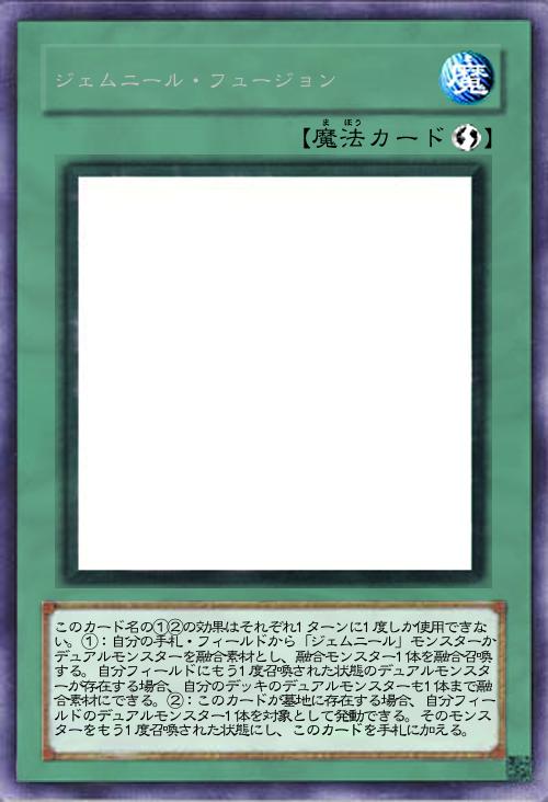 | このカード名の①②の効果はそれぞれ1ターンに1度しか使用できない。①:自分の手札・フィールドから「ジェムニール」モンスターかデュアルモンスターを融合素材とし、融合モンスター1体を融合召喚する。自分フィールドにもう1度召喚された状態のデュアルモンスターが存在する場合、自分のデッキのデュアルモンスターも1体まで融合素材にできる。②:このカードが墓地に存在する場合、自分フィールドのデュアルモンスター1体を対象として発動できる。そのモンスターをもう1度召喚された状態にし、このカードを手札に加える。 | |||