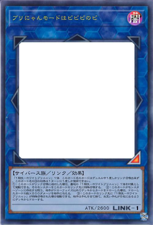 | 「1期生-ホワイトブリニャン」1体 このカード名のカードはデュエル中1度しかリンク召喚出来ず、このカード名の③の効果は1ターンに1度しか使用できない。 ①:このカードがリンク召喚に成功した場合、墓地の「1期生-ホワイトブリニャン」1体を対象として発動できる。そのモンスターをこのカードのリンク先に特殊召喚する。 ②:このカードがモンスターゾーンに存在する限り、相手がドローフェイズ以外でデッキからカードをドローした場合、ドローしたカードの数×500ダメージを相手に与える。 ③:このカードのリンク先に「1期生-ホワイトブリニャン」が特殊召喚された場合発動できる。相手は手札を全て捨て、お互い手札が5枚になるようにデッキからドローする。 | |||