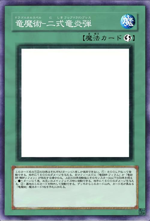 | このカード名の①②の効果はそれぞれ1ターンに1度しか使用できない。①:800LP払って発動できる。相手に1500のダメージを与える。自分フィールドに「竜術師-フィラム」か「竜術師-導師リフォン」が存在する場合のみ、上記の効果発動後にそのモンスターは以下の効果を得る。●1ターンに1度、お互いのメインフェイズ時に発動できる。相手に1500のダメージを与える。②:墓地のこのカードを除外して発動できる。デッキからこのカード以外、カード名が異なる「竜魔術」魔法カード1枚を手札に加える。 | |||