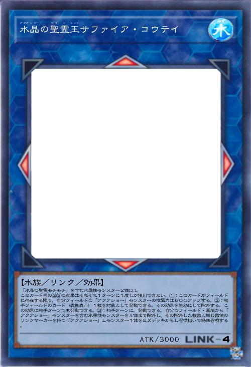 | 「水晶の聖霊モチモチ」を含む水属性モンスター2体以上 このカード名の②③の効果はそれぞれ1ターンに1度しか使用できない。①:このカードがフィールドに存在する限り、自分フィールドの「アクアショー」モンスターの攻撃力は500アップする。②:相手フィールドのカード(表側表示)1枚を対象として発動できる。その効果を無効にして除外する。この効果は相手ターンでも発動できる。③:相手ターンに、発動できる。自分のフィールド・墓地から「アクアショー」モンスターを含む水属性モンスターを4体まで除外し、その除外した枚数と同じ数値のリンクマーカーを持つ「アクアショー」Lモンスター1体をEXデッキからL召喚扱いで特殊召喚する。 | |||
