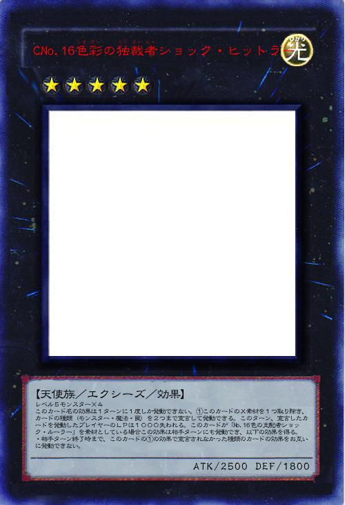 | レベル5モンスター×4 このカード名の効果は1ターンに1度しか発動できない。①このカードのX素材を1つ取り除き、カードの種類(モンスター・魔法・罠)を2つまで宣言して発動できる。このターン、宣言したカードを発動したプレイヤーのLPは1000失われる。このカードが「No.16色の支配者ショック・ルーラー」を素材としている場合この効果は相手ターンにも発動でき、以下の効果を得る。 ・相手ターン終了時まで、このカードの①の効果で宣言されなかった種類のカードの効果をお互いに発動できない。 | |||