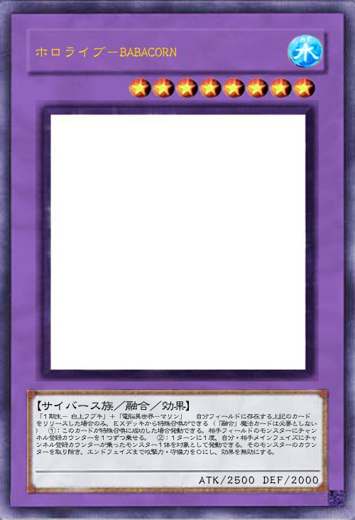 | 「1期生- 白上フブキ」+「電脳異世界-マリン」 自分フィールドに存在する上記のカードをリリースした場合のみ、EXデッキから特殊召喚ができる(「融合」魔法カードは必要としない) ①:このカードが特殊召喚に成功した場合発動できる。相手フィールドのモンスターにチャンネル登録カウンターを1つずつ乗せる。 ②:1ターンに1度、自分・相手メインフェイズにチャンネル登録カウンターが乗ったモンスター1体を対象として発動できる。そのモンスターのカウンターを取り除き、エンドフェイズまで攻撃力・守備力を0にし、効果を無効にする。 | |||