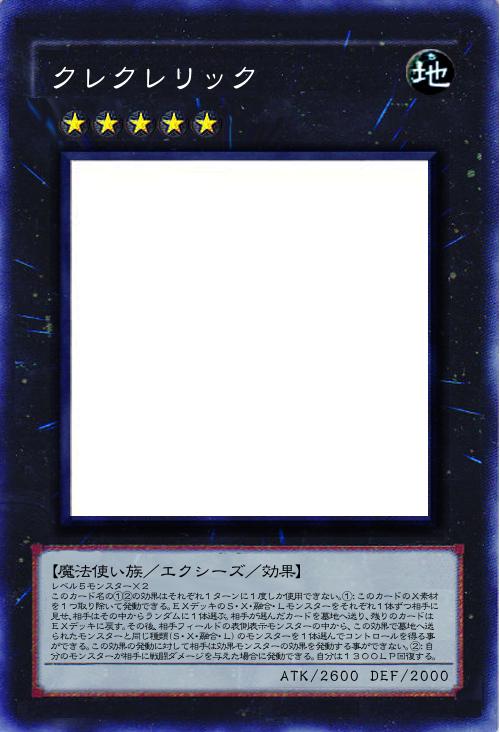 | レベル5モンスター×2 このカード名の①②の効果はそれぞれ1ターンに1度しか使用できない。①:このカードのX素材を1つ取り除いて発動できる。EXデッキのS・X・融合・Lモンスターをそれぞれ1体ずつ相手に見せ、相手はその中からランダムに1体選ぶ。相手が選んだカードを墓地へ送り、残りのカードはEXデッキに戻す。その後、相手フィールドの表側表示モンスターの中から、この効果で墓地へ送られたモンスターと同じ種類(S・X・融合・L)のモンスターを1体選んでコントロールを得る事ができる。この効果の発動に対して相手は効果モンスターの効果を発動する事ができない。②:自分のモンスターが相手に戦闘ダメージを与えた場合に発動できる。自分は1300LP回復する。 | |||