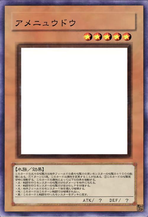 | このカードの元々の攻撃力は相手フィールドの最も攻撃力の高いモンスターの攻撃力+100の数値になる。①1ターンに1度、このカードは属性を変更することが出来る。②このカードの攻撃宣言時に発動する。このカードの属性によって以下の効果を発動する。 ・炎:戦闘を行うモンスターの攻撃力分のダメージを相手に与える。 ・水:戦闘を行うモンスターの攻撃力分自分のLPを回復する。 ・光:相手フィールドのモンスター1体を選んで破壊する。 ・地:このカードはこのターン戦闘では破壊されない。 ・風:このカードと戦闘を行ったモンスターをデッキに戻す。 | |||