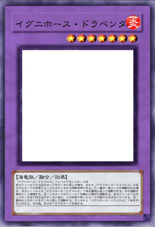 | 「イグニホース・ドラゴニス」+レベル7モンスター2体 自分フィールドの上記のカードをデッキに戻した場合、または「イグニホース・ドラゴニス」と記されたカードの効果によってEXデッキから特殊召喚できる。①:魔法・罠カードが発動された場合、自分フィールドの「イグニホース・ドラゴニス」1体を墓地に送って発動できる。その発動を無効にして破壊する。②:このカードがフィールドを離れた場合に発動する。自分フィールドのモンスターを全て持ち主のデッキに戻す。この効果で戻したカードの数だけ自分はドローする。③:墓地のこのカードをデッキに戻して発動する。デッキから「イグニホース・ドラゴニス」1体を手札に加える。その後、自分は100ダメージを受ける。 | |||
