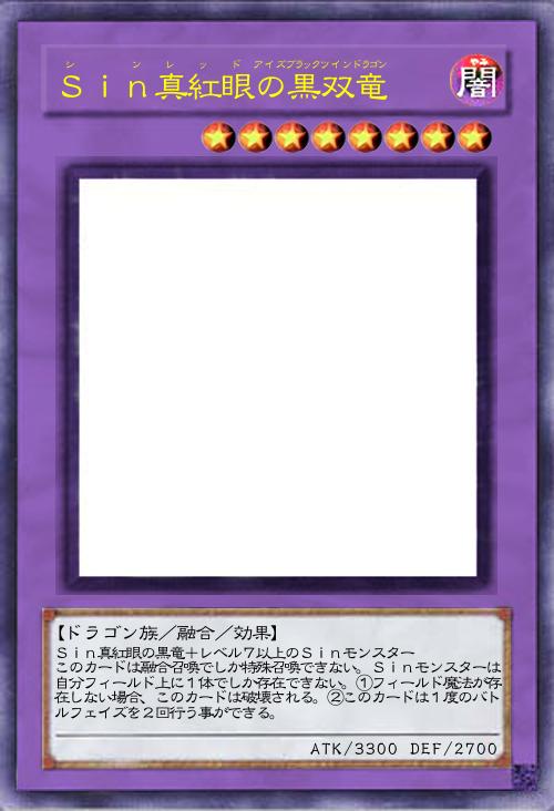 | Sin真紅眼の黒竜+レベル7以上のSinモンスター このカードは融合召喚でしか特殊召喚できない。Sinモンスターは自分フィールド上に1体でしか存在できない。①フィールド魔法が存在しない場合、このカードは破壊される。②このカードは1度のバトルフェイズを2回行う事ができる。 | |||
